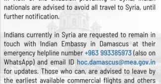 ನ್ಯೂಸ್ ಸಿರಿಯಾದಲ್ಲಿ ಹಿಂಸಾಚಾರ: ಕೂಡಲೇ ದೇಶ ತೊರೆಯಲು ಭಾರತೀಯರಿಗೆ ಸೂಚನೆ ಡೆಮಾಸ್ಕಸ್: ಸಿರಿಯಾದಲ್ಲಿ ಹದಗೆಡುತ್ತಿರುವ ಪರಿಸ್ಥಿತಿಯ ಬಗ್ಗೆ ಭಾರತ ಸರ್ಕಾರ ಕಳವಳ ವ್ಯಕ್ತಪಡಿಸಿದ್ದು ಆದಷ್ಟು ಬೇಗ ಅಲ್ಲಿಂದ...