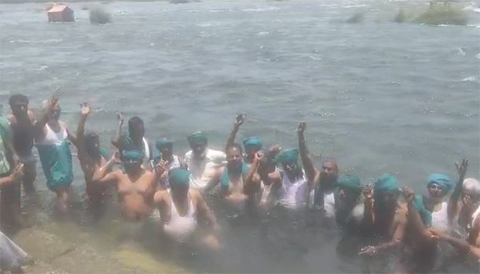 ಮಂಡ್ಯ: ಜಿಲ್ಲೆಯ ಶ್ರೀರಂಗಪಟ್ಟಣ ತಾಲೂಕಿನ ಕೆ ಆರ್ ಎಸ್ ನದಿಯಿಂದ ನೀರನ್ನು ಹರಿಸುತ್ತಿರುವುದನ್ನು ಖಂಡಿಸಿ ರಂಗನಾಥಸ್ವಾಮಿ ದೇವಸ್ಥಾನದ ಬಳಿ ಇರುವ ಸ್ನಾನ ಘಟ್ಟದ ನದಿಯಲ್ಲಿ ಭೂಮಿ ಸೇವಾ ಸಮಿತಿ ಹಾಗೂ ರೈತ ಸಂಘದವರು ಅರೆ ಬೆತ್ತಲೆಯಾಗಿ ನದಿಯಲ್ಲಿ ಇಳಿದು ರಾಜ್ಯ ಸರ್ಕಾರದ ವಿರುದ್ಧ ಘೋಷಣೆಯನ್ನು ಕೂಗಿದರು.