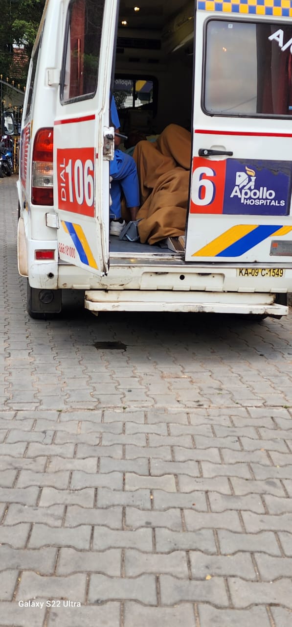 ಮೈಸೂರಿನ ಅಪೊಲೋ ಆಸ್ಪತ್ರೆಯಲ್ಲಿ ತುರ್ತು ಚಿಕಿತ್ಸೆ ಪಡೆಯುತ್ತಿದ್ದ ಸರ್ವೆಯರ್ ಡ್ಯೂಟಿ ರಿಪೋರ್ಟ್ ಮಾಡಿಕೊಳ್ಳಲು ಆಂಬ್ಯುಲೆನ್ಸ್ ನಲ್ಲಿ ಬಂದಿದ್ದಾರೆ.