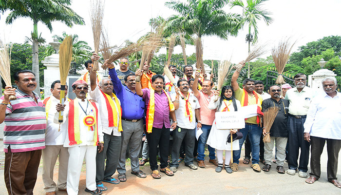 ಮೈಸೂರು: ನಮ್ಮ ಜಲಾಶಯಗಳಲ್ಲಿ ನೀರಿಲ್ಲದಿದ್ದರೂ, ತಮಿಳುನಾಡಿಗೆ ಪದೇ ಪದೇ ನೀರು ಬಿಡಿ ಎಂದು ಆದೇಶ ಮಾಡುತ್ತಿರುವ ಕಾವೇರಿ ನೀರು ನಿರ್ವಹಣಾ ಪ್ರಾಧಿಕಾರ ಹಾಗೂ ತಮಿಳುನಾಡಿನ ವಿರುದ್ಧ ಕರ್ನಾಟಕ ಸೇನಾ ಪಡೆ ಹಾಗೂ ಅಖಿಲ ಕರ್ನಾಟಕ ಒಕ್ಕಲಿಗರ ಸಂಘದವರು ಮೈಸೂರಿನ ಜಿಲ್ಲಾ ಪಂಚಾಯತ್ ಕಚೇರಿ ಮುಂಭಾಗ ಪೊರಕೆ ಚಳವಳಿ ನಡೆಸಿದರು.