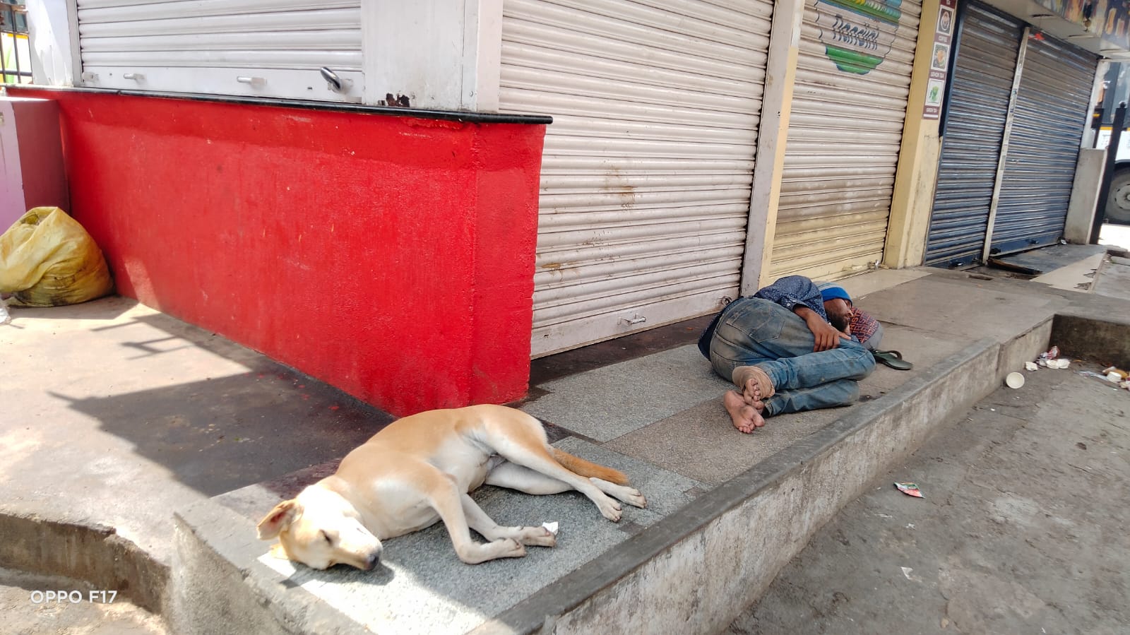 ಬಹುತೇಕ ಅಂಗಡಿ ಮುಗ್ಗಟ್ಟುಗಳು ನಗರದಲ್ಲಿ ಮುಚ್ಚಿದ್ದವು.ಅಂಗಡಿಗಳ ಶೆಡ್ ಮುಂದೆ ವ್ಯಕಿ ಹಾಗೂ ನಾಯಿ ಹಾಯಾಗಿ ಮಲಗಿದ್ದುದು ಕಂಡು ಬಂದಿತು.