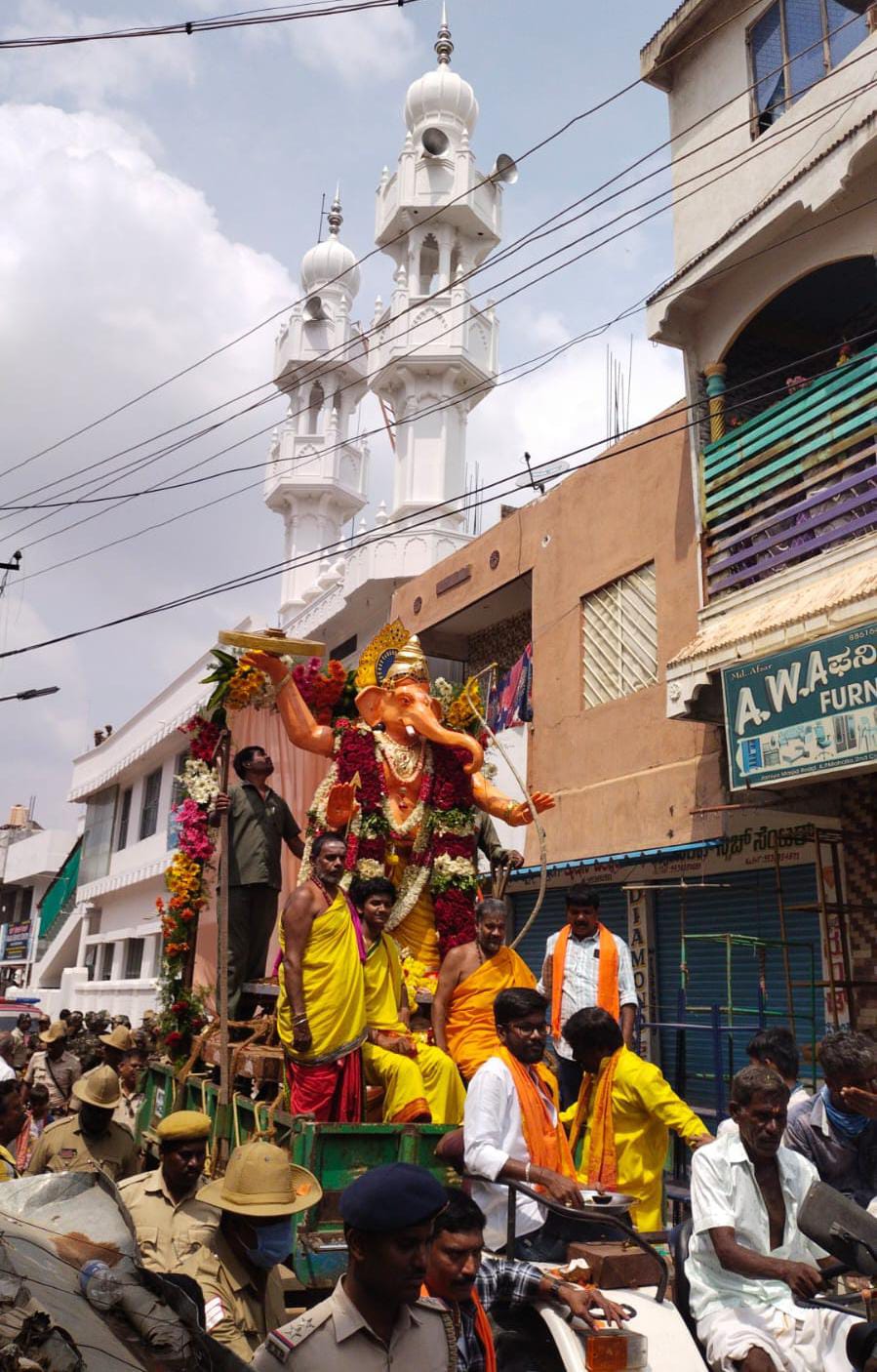 ಮೆರವಣಿಗೆಯು ಖಡಕ್ ಪುರ ಮೊಹಲ್ಲಾ ಬೀದಿ, ಅಂಬೇಡ್ಕರ್ ಬೀದಿ, ಡೀವಿಯಷನ್ ರಸ್ತೆ, ದೇವಾಂಗ ಬೀದಿ, ದೊಡ್ಡ ಅಂಗಡಿ ಬೀದಿ, ಚಿಕ್ಕ ಅಂಗಡಿ ಬೀದಿ ಸಂತೇಮರಳ್ಳಿ ವೃತ್ತ, ಆದಿಶಕ್ತಿ ದೇವಸ್ಥಾನ, ಬಣಜಿಗರ ಬೀದಿ, ಭ್ರಮರಾಂಬ ಎರಡನೇ ಕ್ರಾಸ್, ಕುರುಬರ ಬೀದಿ, ಹಳ್ಳದ ಬೀದಿ, ಅಗ್ರಹಾರ ಬೀದಿ, ನಗರಸಭಾ ಕಚೇರಿ ರಸ್ತೆ, ಚಮಾಲ್ ಬೀದಿ, ವೀರಭದ್ರಸ್ವಾಮಿ ದೇವಸ್ಥಾನ ಮೂಲಕ ಹಾದು, ಜೈನರ ಬೀದಿ, ಕೊಳದ ಬೀದಿಯಲ್ಲಿ ಮೆರವಣಿಗೆ ಸಾಗಿ ನಂತರ ದೊಡ್ಡ ಅರಸನ ಕೊಳದಲ್ಲಿ ಗಣಪತಿಯನ್ನು ವಿಸರ್ಜನೆ ಮಾಡಲಾಯಿತು