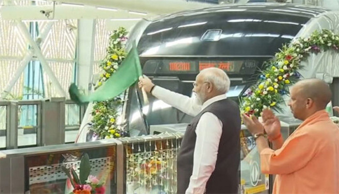 ಭಾರತದಲ್ಲಿ ಪ್ರಾದೇಶಿಕ ಕ್ಷಿಪ್ರ ಸಾರಿಗೆ ವ್ಯವಸ್ಥೆ (ಆರ್ ಆರ್ ಟಿಎಸ್) ಆರಂಭದ ಅಂಗವಾಗಿ ಮೋದಿ ಸಾಹಿಬಾಬಾದ್ನಿಂದ ದುಹೈ ಡಿಫೋಗೆ ಸಂಪರ್ಕಿಸುವ ರಾಪಿಡ್ಎಕ್ಸ್ ರೈಲು ಸಂಚಾರಕ್ಕೆ ಹಸಿರು ನಿಶಾನೆ ತೋರಿದರು.