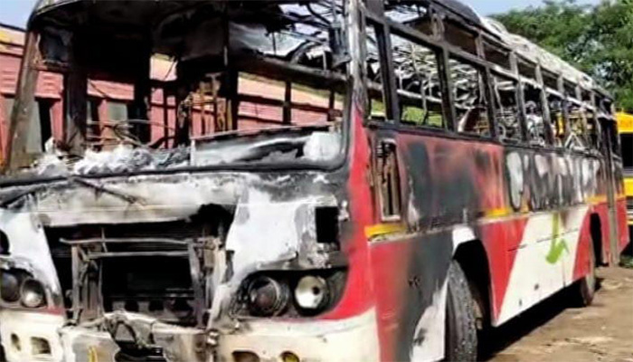 ಸೋಮವಾರ ಬೀದರ್ ಜಿಲ್ಲೆಯ ಭಾಲ್ಕಿಯಿಂದ ಪುಣೆಗೆ ಹೊರಟಿದ್ದ ಬಸ್ ಗೆ (ಸಂಖ್ಯೆ ಕೆ.ಎ-38 ಎಫ್-1201 ) ಮಹಾರಾಷ್ಟ್ರದ ಉಮರ್ಗಾ ಬಳಿಯ ತರುರಿ ಗ್ರಾಮದಲ್ಲಿ ಪ್ರತಿಭಟನಾಕಾರರು ಬಸ್ ತಡೆದು ಪ್ರಯಾಣಿಕರನ್ನು ಕೆಳಗಿಳಿಸಿ ಬಸ್ಸಿಗೆ ಬೆಂಕಿ ಹಚ್ಚಿದ್ದಾರೆ.