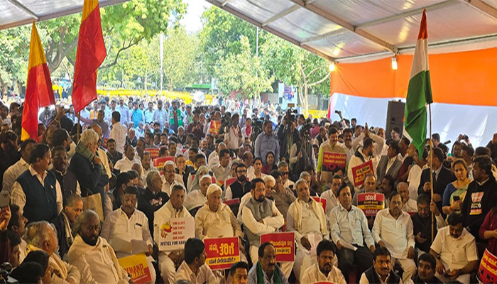 ಕರ್ನಾಟಕ ರಾಜ್ಯಕ್ಕೆ ಆಗಿರುವ ಅನ್ಯಾಯವನ್ನು ಕೇಂದ್ರ ಸರ್ಕಾರದ ಗಮನಕ್ಕೆ ತರಲು ಇಲ್ಲಿ ಪ್ರತಿಭಟನೆ ನಡೆಸುತ್ತಿದ್ದೇವೆ ಎಂದು ಹೇಳಿದರು.