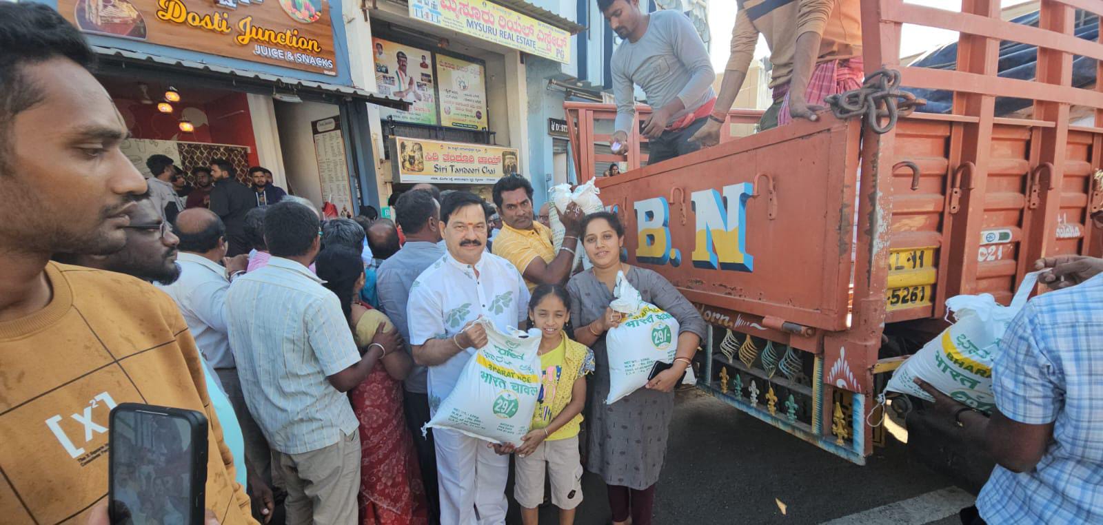 ಮಾಜಿ ಸಚಿವ ಎಸ್.ಎ ರಾಮದಾಸ್ ಸಾರ್ವಜನಿಕರಿಗೆ ಅಕ್ಕಿ ವಿತರಿಸುವ ಮೂಲಕ ಉದ್ಘಾಟಿಸಿದರು.