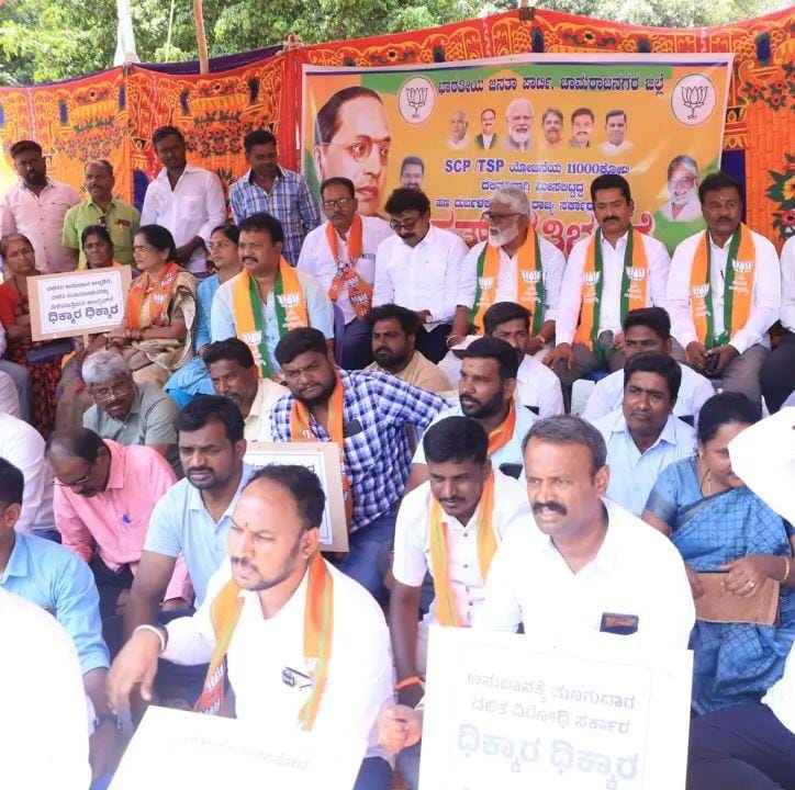 ಚಾಮರಾಜನಗರ: ರಾಜ್ಯ ಕಾಂಗ್ರೆಸ್ ಸರ್ಕಾರವು ಗ್ಯಾರಂಟಿ ಯೋಜನೆಗಳ ಜಾರಿಗೆ ಎಸ್ಸಿಎಸ್ಪಿ, ಟಿಎಸ್ಪಿ ಹಣ ದುರ್ಬಳಕೆ ಮಾಡಿಕೊಂಡು ದಲಿತರಿಗೆ ಅನ್ಯಾಯ ಮಾಡಿದೆ ಎಂದು ಆರೋಪಿಸಿ ಜಿಲ್ಲಾ ಬಿಜೆಪಿ ಘಟಕದ ಪದಾಧಿಕಾರಿಗಳು, ಕಾರ್ಯಕರ್ತರು ನಗರದಲ್ಲಿ ಪ್ರತಿಭಟನೆ ನಡೆಸಿದರು.