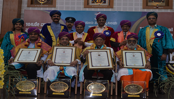 ಸಮಾಜ, ದೇಶ, ಜ್ಞಾನ, ವಿಜ್ಞಾನ, ಕ್ರೀಡಾ ಕ್ಷೇತ್ರದಲ್ಲಿ ಧರ್ಮ, ಸಂಸ್ಕೃತಿ, ಸಂವರ್ಧನೆ ಹಾಗೂ ಸಂರಕ್ಷಣೆಗಾಗಿ ಅತ್ಯುತ್ತಮ ಹಾಗೂ ಅನುಪಮ ಕಾರ್ಯಗಳನ್ನು ಮಾಡಿರುವ ಮಹಾನ್ ವ್ಯಕ್ತಿಗಳನ್ನು ವಿಶ್ವವಿದ್ಯಾಲಯವು ಗೌರವಿಸುತ್ತಿರುವುದು ಸಂತಸದ ಸಂಗತಿ. ಈ ಘಟಿಕೋತ್ಸವ ಸಮಾರಂಭದಲ್ಲಿ ಗೌರವಾನ್ವಿತ ಶ್ರೀ ಎಸ್.ಎಂ. ಕೃಷ್ಣಾ , ಪ್ರಾಧ್ಯಾಪಕ ಡಾ. ಭಾಷ್ಯಂ ಸ್ವಾಮೀಜಿ ಮತ್ತು ಶ್ರೀ ಎಂ.ಆರ್. ಸೀತಾರಾಮ್ ಅವರಿಗೆ ಗೌರವ ಪದವಿ ನೀಡಿ ಗೌರವಿಸಲಾಗಿದೆ. 103ನೇ ಘಟಿಕೋತ್ಸವ ಸಮಾರಂಭದಲ್ಲಿ ವಿಶ್ವವಿಖ್ಯಾತ ಕ್ರಿಕೆಟಿಗರಾದ ಗೌರವಾನ್ವಿತ ಶ್ರೀ ಜಾವಗಲ್ ಶ್ರೀನಾಥ್ ಅವರಿಗೆ ಗೌರವ ಪದವಿ ನೀಡಿ ಗೌರವಿಸಲು ನಿರ್ಧರಿಸಲಾಗಿತ್ತು ಆದರೆ ಅವರ ಬಿಡುವಿಲ್ಲದ ಕಾರಣ ಅಂದು ಬರಲಾಗಲಿಲ್ಲ. ಈ ಘಟಿಕೋತ್ಸವದಲ್ಲಿ ಅವರನ್ನೂ ಗೌರವಿಸಲಾಗಿದೆ. ಈ ಸಾಧಕರ ಸಾಧನೆ ಪ್ರತಿಯೊಬ್ಬರಿಗೂ ಸ್ಫೂರ್ತಿ. ಈ ಸಾಧಕರ ಸಾಧನೆ ಹೀಗೆ ನಿರಂತರವಾಗಿರಲಿ ಎಂದು ಆಶಿಸುತ್ತೇನೆ ಎಂದರು.