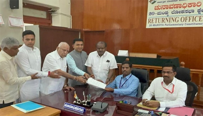 ಮಂಡ್ಯದ ಜಿಲ್ಲಾಧಿಕಾರಿ ಕಚೇರಿಯಲ್ಲಿ ಬಿಜೆಪಿ- ಜೆಡಿಎಸ್ ಮೈತ್ರಿ ಅಭ್ಯರ್ಥಿಯಾಗಿ ಹೆಚ್. ಡಿ. ಕುಮಾರಸ್ವಾಮಿ ನಾಮಪತ್ರ ಸಲ್ಲಿಸಿದ್ದು, ಬಿಜೆಪಿ ನಾಯಕ ಬಿ.ಎಸ್ ಯಡಿಯೂರಪ್ಪ, ಗೋವಾ ಮುಖ್ಯಮಂತ್ರಿ ಪ್ರಮೋದ್ ಸಾವಂತ್, ಯದುವೀರ್ ಒಡೆಯರ್ ಮತ್ತಿತರರು ಹಾಜರಿದ್ದರು.