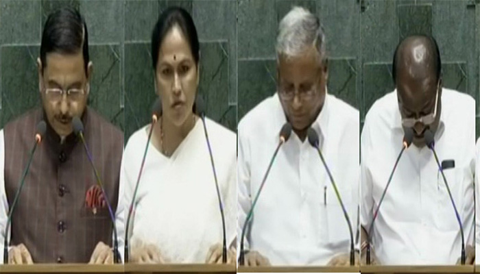 ನವದೆಹಲಿ: ಕೇಂದ್ರ ಸಚಿವರಾದ ಹೆಚ್.ಡಿ ಕುಮಾರಸ್ವಾಮಿ, ಪ್ರಹ್ಲಾದ್ ಜೋಶಿ, ವಿ.ಸೋಮಣ್ಣ ಹಾಗೂ ಶೋಭಾ ಕರಂದ್ಲಾಜೆ ಅವರು ಕನ್ನಡದಲ್ಲಿ ಪ್ರಮಾಣವಚನ ಸ್ವೀಕರಿಸಿ ಕನ್ನಡಾಭಿಮಾನ ಮೆರೆದಿದ್ದಾರೆ