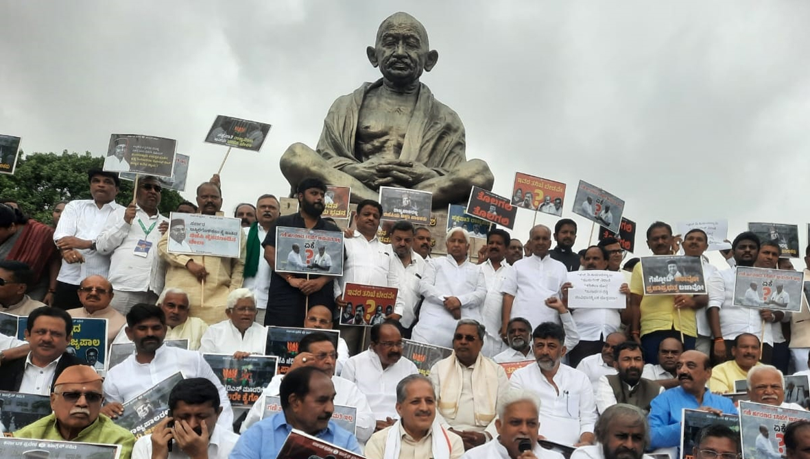 ವಿಧಾನಸೌಧದ ಗಾಂಧಿ ಪ್ರತಿಮೆ ಬಳಿ ನಡೆದ ಪ್ರತಿಭಟನೆಯಲ್ಲಿ ಸಿದ್ದರಾಮಯ್ಯ ಮತ್ತು ಉಪಮುಖ್ಯಮಂತ್ರಿ ಡಿ. ಕೆ ಶಿವಕುಮಾರ್ ಸೇರಿದಂತೆ ಸಚಿವರು, ಶಾಸಕರು, ಸಂಸದರು ಭಾಗವಹಿಸಿದ್ದರು.