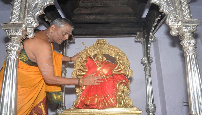 ಮೈಸೂರಿನ ಚಾಮುಂಡಿ ಬೆಟ್ಟದಲ್ಲಿ ನಾಡ ಅಧಿದೇವತೆ ಚಾಮುಂಡೇಶ್ವರಿ ಸನ್ನಿಧಿಯಲ್ಲಿ ನಾಳೆ ದಸರಾ ಮಹೋತ್ಸವಕ್ಕೆ ಚಾಲನೆ ನೀಡಲಾಗುತ್ತದೆ.ಅದಕ್ಕಾಗಿ ದೇವಿಯ ಉತ್ಸವ ಮೂರ್ತಿಗೆ ಹಿರಿಯ ಅರ್ಚಕರಾದ ಶ್ರೀ ಶಶಿಶೇಖರ ದೀಕ್ಷಿತ್ ಅವರು ಅಂತಿಮ ಟಚ್ ನೀಡಿದರು.