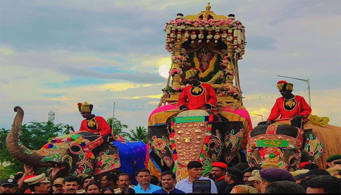ನಾಡ ಅಧಿದೇವತೆ ಚಾಮುಂಡೇಶ್ವರಿ ಅಮ್ಮನವರು ಸರ್ವಾಲಾಲಂಕೃತಗೊಂಡ ಮಹೇಂದ್ರ ಆನೆಯ ಮೇಲೆ ಸಿಂಹಾಸನದೀಶ್ವರಿಯಾಗಿ ಗಜ ಗಾಂಭೀರ್ಯದಿಂದ ರಾಜಮಾರ್ಗದಲ್ಲಿ ಹೆಜ್ಜೆ ಹಾಕಿದಾಗ ಜಾನಪದ ಕಲಾ ತಂಡಗಳು,