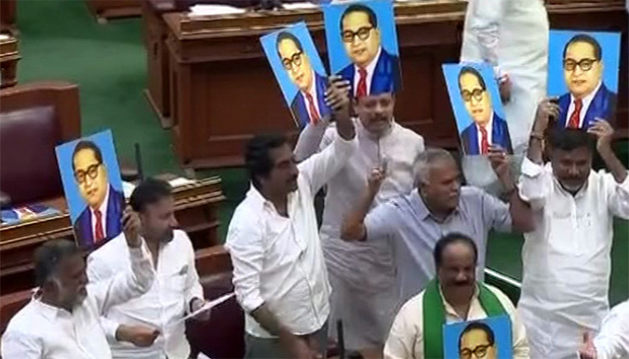 ಸದನದಲ್ಲಿ ಒಟ್ಟಾಗಿ ನಿಂತು ಅಂಬೇಡ್ಕರ್ ಫೊಟೋ ಹಿಡಿದು ಕಾಂಗ್ರೆಸ್ ಸದಸ್ಯರು ಧಿಕ್ಕಾರ ಕೂಗಿದರು. ಈ ಸಂದರ್ಭದಲ್ಲಿ ಬಿಜೆಪಿಯವರು ಕಾಂಗ್ರೆಸ್ನಿಂದಲೇ ಅಂಬೇಡ್ಕರ್ ಅವರಿಗೆ ಅನ್ಯಾಯವಾಗಿದೆ ಎಂದು ಹೇಳಿ ಪ್ರತಿಭಟಿಸಿದರು.ಈ ವೇಳೆ ಯಾರೊಬ್ಬರ ಮಾತೂ ಕೇಳದಂತೆ ಗದ್ದಲವಾಯಿತು.