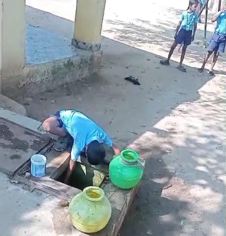 ಸುಮಾರು 10 ಅಡಿ ಆಳವಿರುವ ಸಂಪ್ ನಿಂದ ಮಕ್ಕಳು ಬಿಂದಿಗೆಯಲ್ಲಿ ನೀರು ತೆಗೆಯುತ್ತಿದ್ದಾರೆ.ಆಯತಪ್ಪಿ ಬಿದ್ದರೆ ಯಾರು ಹೊಣೆ?ಇದನ್ನು ಕೇಳುವವರು ಯಾರೂ ಇಲ್ಲವೆ?.