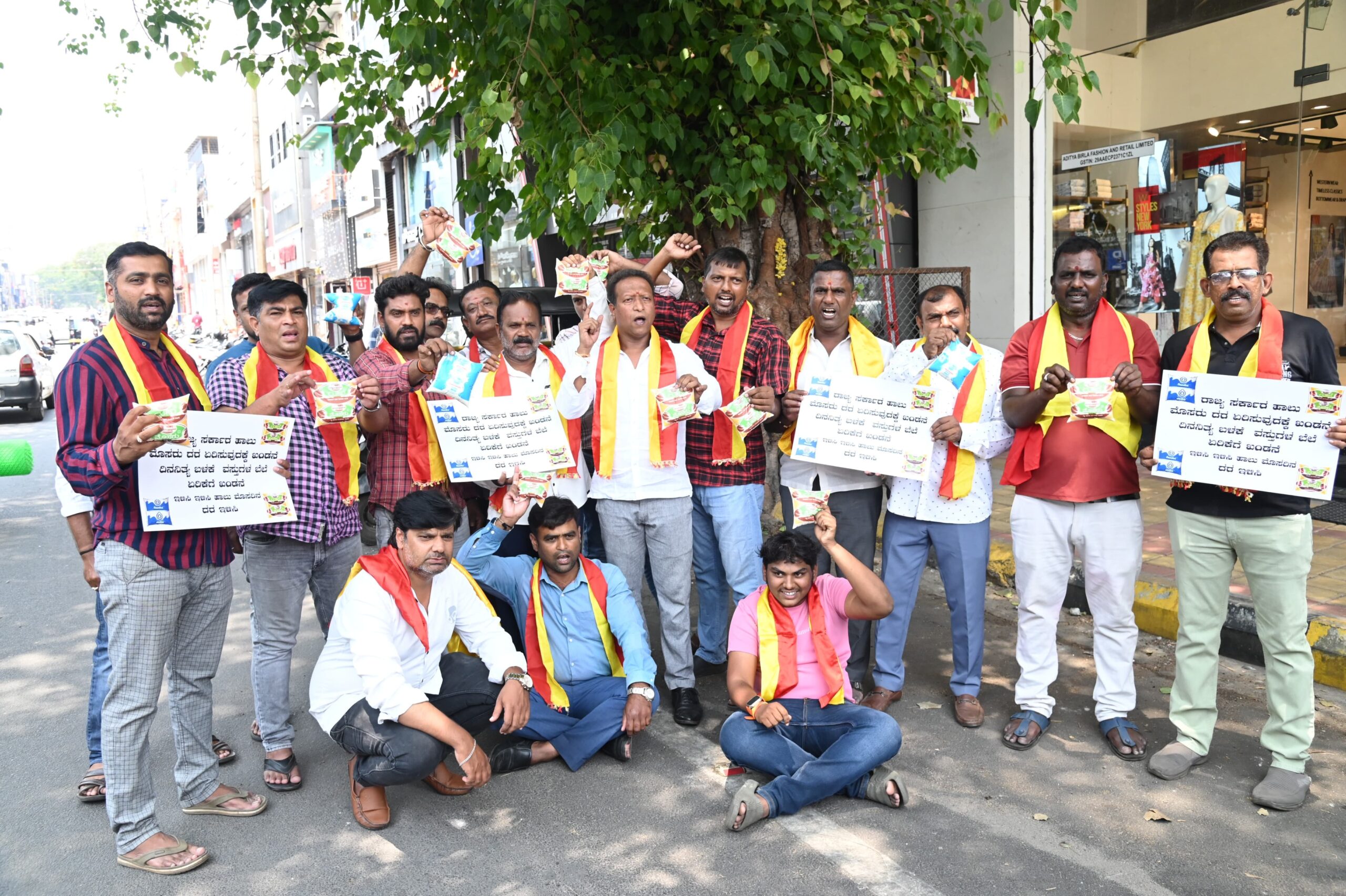 ಸರ್ಕಾರದ ಗಮನ ಸೆಳೆಯಲು ಕರ್ನಾಟಕ ಹಿತರಕ್ಷಣಾ ವೇದಿಕೆಯ ಕಾರ್ಯಕರ್ತರು ಹಾಲು, ಮೊಸರನ್ನು ತಲೆ ಮೇಲೆ ಹೊತ್ತು ಅಣುಕು ಪ್ರದರ್ಶನ ಮಾಡಿ ವಿನೂತನ ಪ್ರತಿಭಟನೆ ಮಾಡಿದರು.