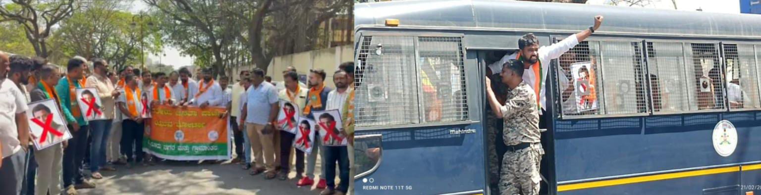 ಬಿಜೆಪಿಯ ಯುವ ಮೋರ್ಚಾ ಕಾರ್ಯಕರ್ತರು ಪ್ರತಿಭಟನೆ ನಡೆಸಿದರು.