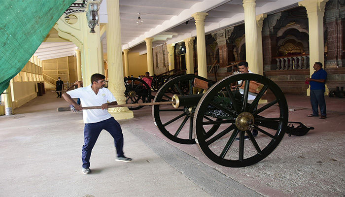 ಅರಮನೆ ಆವರಣದಲ್ಲಿ ಮಂಗಳವಾರ ಫಿರಂಗಿಯ ಮೂಲಕ ಮದ್ದುಗುಂಡು ಸಿಡಿಸುವ ಡ್ರೈ ತಾಲೀಮು ನಡೆಯಿತು.